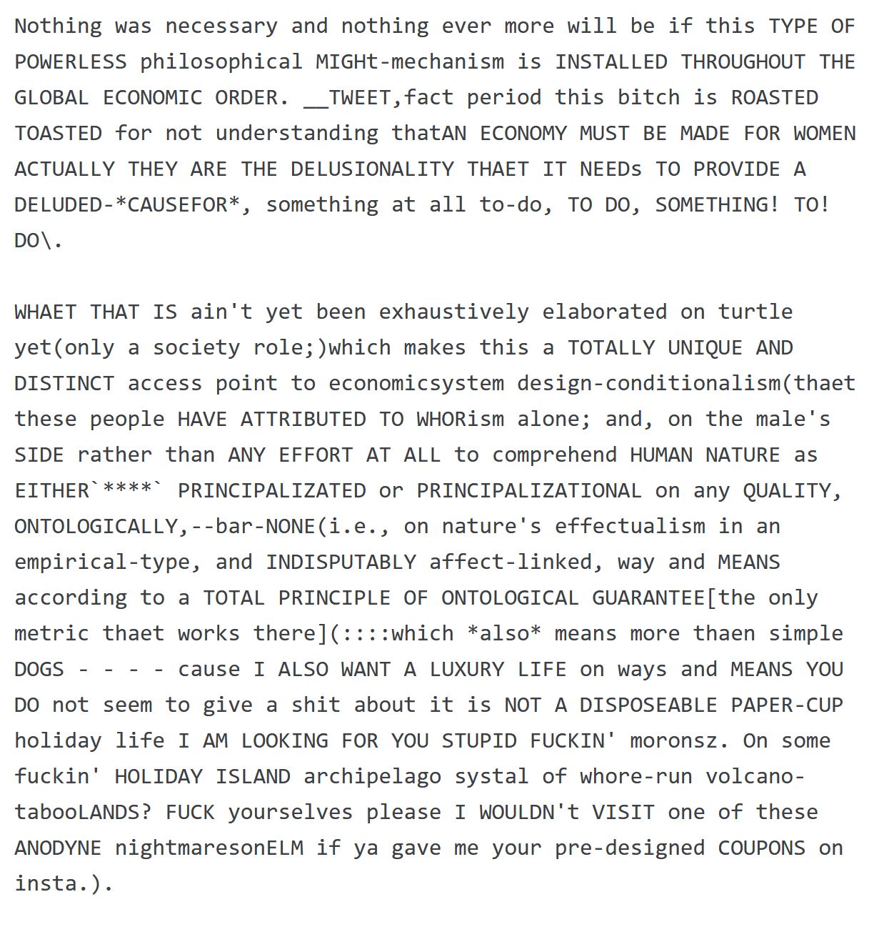 Nothing was necessary and nothing ever more will be if this TYPE OF POWERLESS philosophical MIGHt-mechanism is INSTALLED THROUGHOUT THE GLOBAL ECONOMIC ORDER. __TWEET,fact period this bitch is ROASTED TOASTED for not understanding thatAN ECONOMY MUST BE MADE FOR WOMEN ACTUALLY THEY ARE THE DELUSIONALITY THAET IT NEEDs TO PROVIDE A DELUDED-CAUSEFOR, something at all to-do, TO DO, SOMETHING! TO!DO.